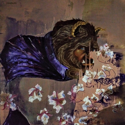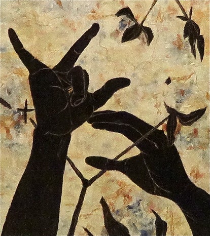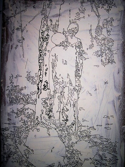 16"x16" Oil and wood stain on etched wood panel (diptych)